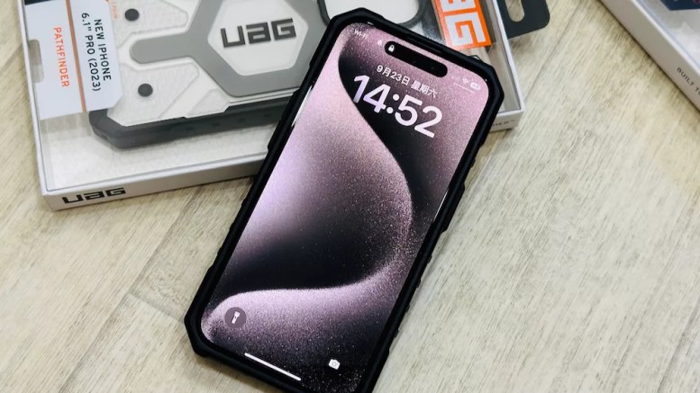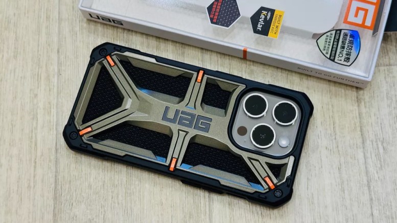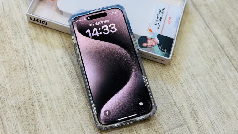 iPhone 15 Pro 原色鈦金屬,實際裝上 頂級特仕系列「軍用灰」的樣子,顏色上算蠻搭的;頂級特仕系列有高摩擦力防滑、邊框加高設計,還有杜邦 Kevlar 防彈纖維材質。