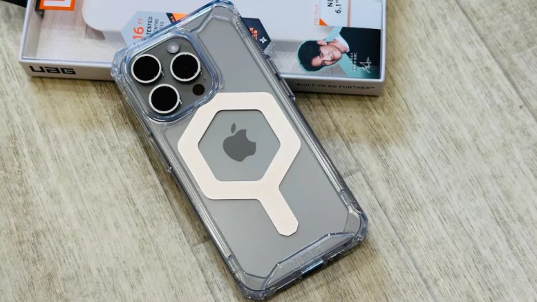 透色系列 MagSafe 使用 25% 再生材料製成,蜂巢式結構、三層防護,不論是透黑或透明款,搭配 iPhone 15 Pro 原色鈦金屬,都很好看,可以看得到手機機身顏色。